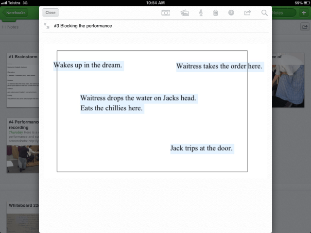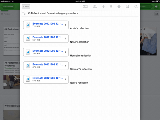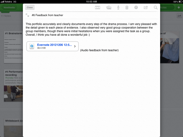 After all performances were presented, the students were given a chance to view their short slapstick scenes, and then use the reflection help-sheet to write their four-sentence reflections and the task-sheet evaluation checklist to evaluate the process as well as the final product. For the year 7 classes (who have iPads), I allowed them to record their reflections orally and attach them to their Evernote group-portfolios/shared-notebooks. After the lesson, I looked through all group-portfolios and I attached my written and oral feedback, and final assessment.