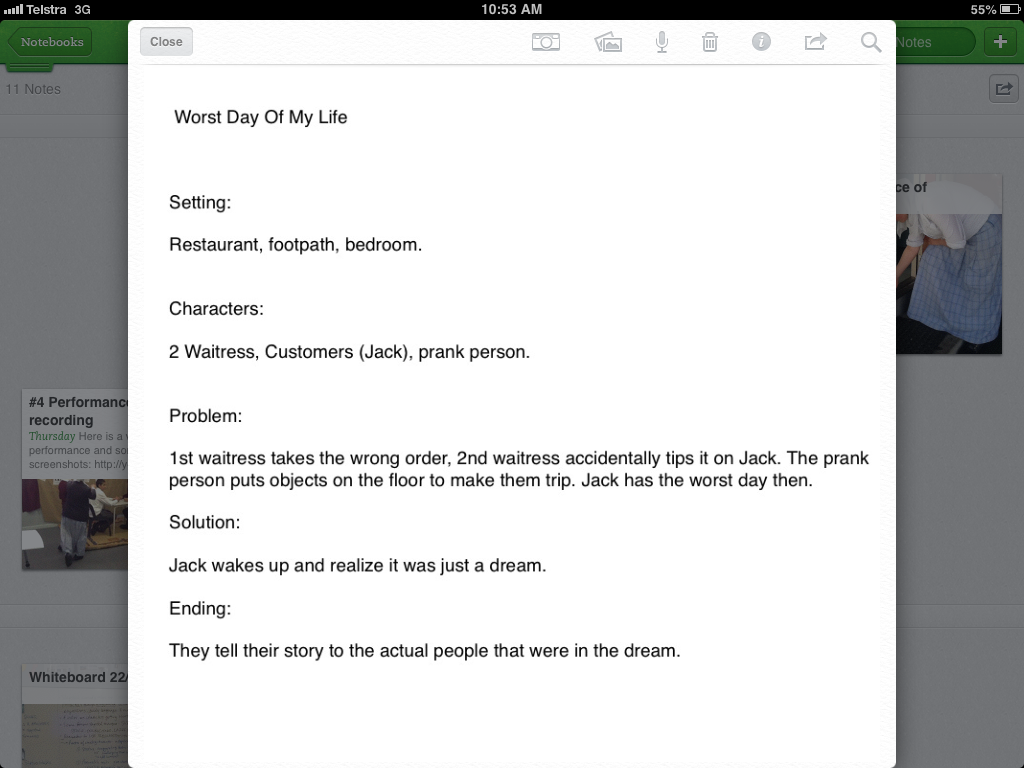 The warm-up for the lesson was a One-Sentence-Story with the title “The Worst Day of My Life”. We all sat in a circle and every student had to add one sentence to the story. This warm-up was chosen to get them to think about accidents and mishaps, which is what slapstick is mostly about, and as a preparation for the assessment task to follow. The students then moved into groups and were told that we will start the first step of the drama process this week to prepare a slapstick comedy performance titled “The Worst Day of My Life”. They had to decide on who is going to be the group’s writer and who will be the director for this performance. The students are aware that the first step of the drama process is to brainstorm, and I used this story-map graphic organizer from Education Oasis to get them to think about their performance. Here is a snap-shot of one of the groups’ story-maps.