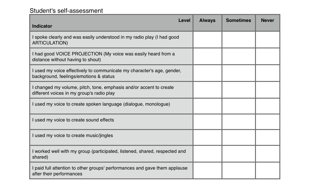 After the warmup and debriefing, the students sat in front of the performance space and formed an audience. Each group subsequently hid behind a curtain set up for the task, and delivered their horror radio play. The audience would then be asked to think like critics and give feedback (positive comments or useful suggestions) for the performers. Each radio play was recorded using my iPad. After all performances, the students were asked to bring out their task sheet and rubric from their drama folders (handed out to them last week). We then heard all the recorded performances through the class projector to help each student reflect on and evaluate his/her performance. Each student listened to his/her group’s performance, used the self-assessment checklist in the task sheet to self-assess, and then gave themselves a mark out of ten using the rubric attached to the task-sheet (in the ‘student’s self assessment’ column).
